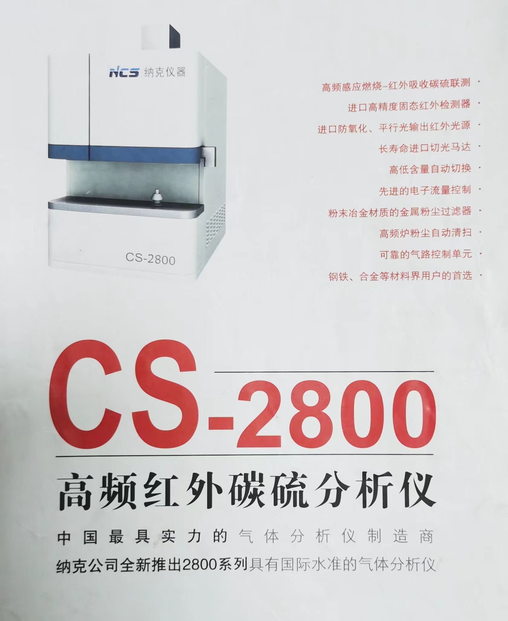 CS-2800 红外碳硫分析仪使用 了最新的燃烧技术,可以快速地分析钢、铸铁、铜、合 金、矿石、煤、水泥、陶瓷、碳化合物、矿物、沙子、玻璃等固体材料及某些高分子有机液体材料中的碳和硫。