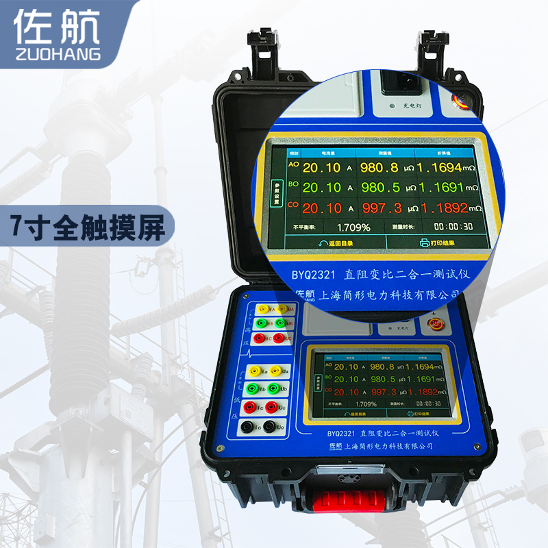 佐航 BYQ2321 直阻变比二合一测试仪,内置大容量锂电池,我们仅需要一套设备,可以完成两个项目的测试,不需要频繁的拆接测试线,7寸全触屏操作,人机友好,操作方便。